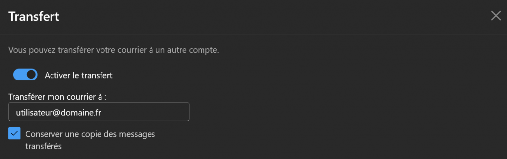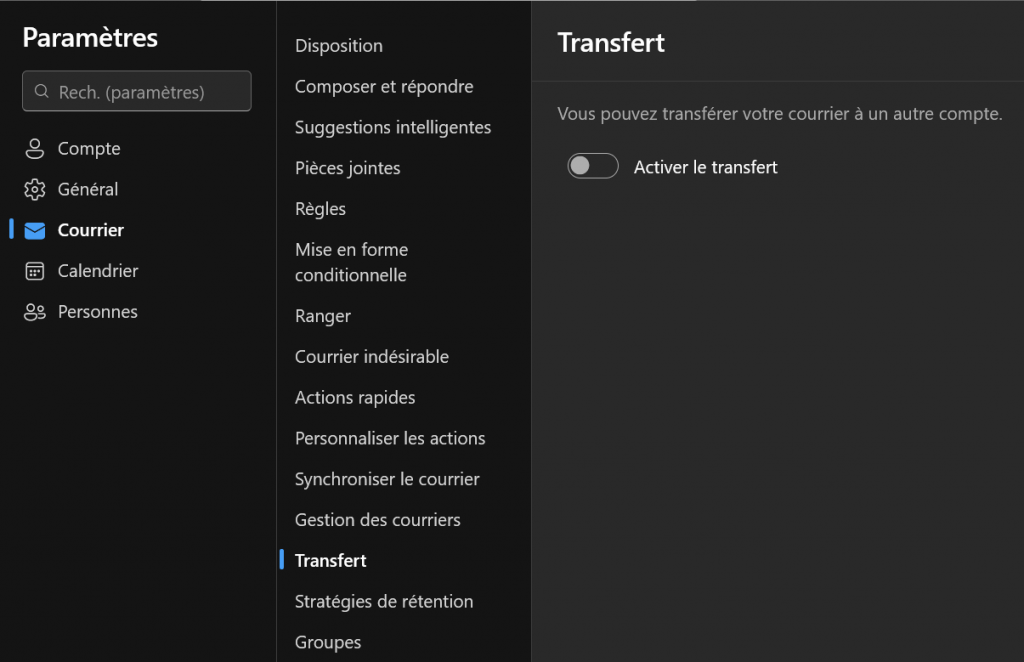 Activer transfert Outlook 1- Se connecter au webmail (www.office.com) Se connecter 2- Ouvrir les paramètres 3- Aller dans Courrier > Transfert 4- Configurer le transfert