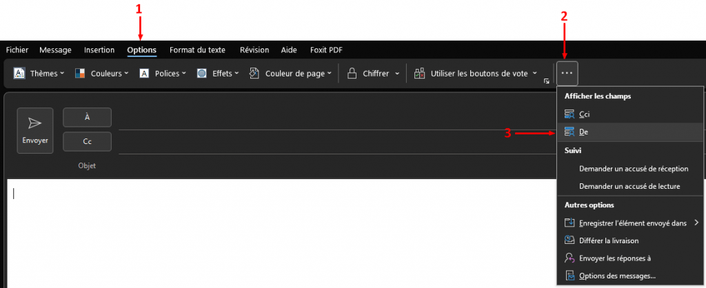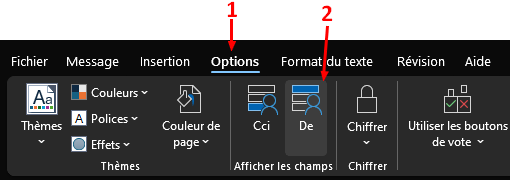 Ajouter le champ De 1- Ouvrir un nouveau message 2- Afficher le champ De dans l’onglet Options Ruban classiqueRuban simplifié