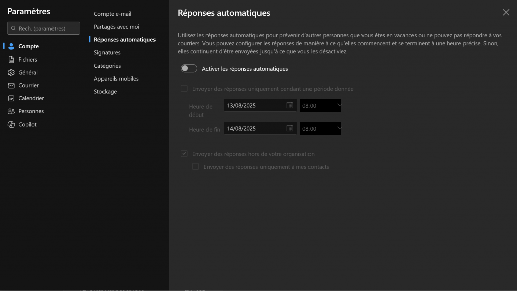Réponses automatiques (absence du bureau) Outlook (classic)Outlook (web) 1- Aller dans le menu fichier 2- Ouvrir Réponses automatiques (absence du bureau) 3- Configurer les réponses automatiques Activer/désactiver les réponses automatiques Définir la période d’activation Configurer la réponse automatique pour vos collègues Configurer la réponse automatique pour les autres Message 1- Aller dans paramètres 2- Compte > Réponses automatiques
